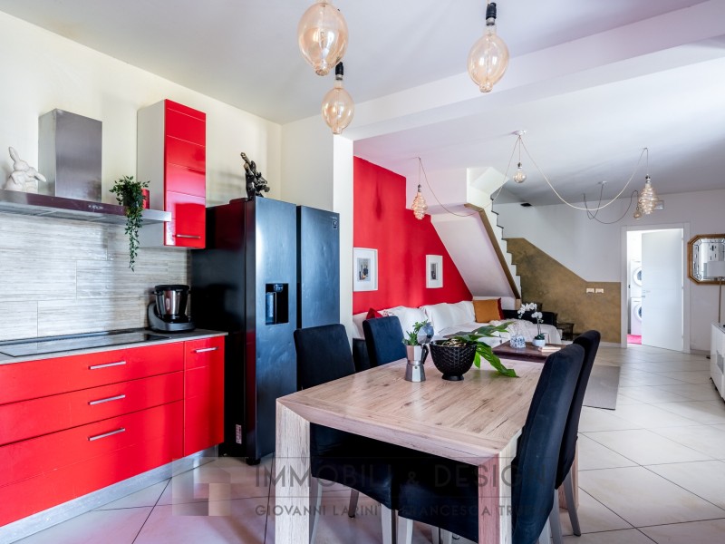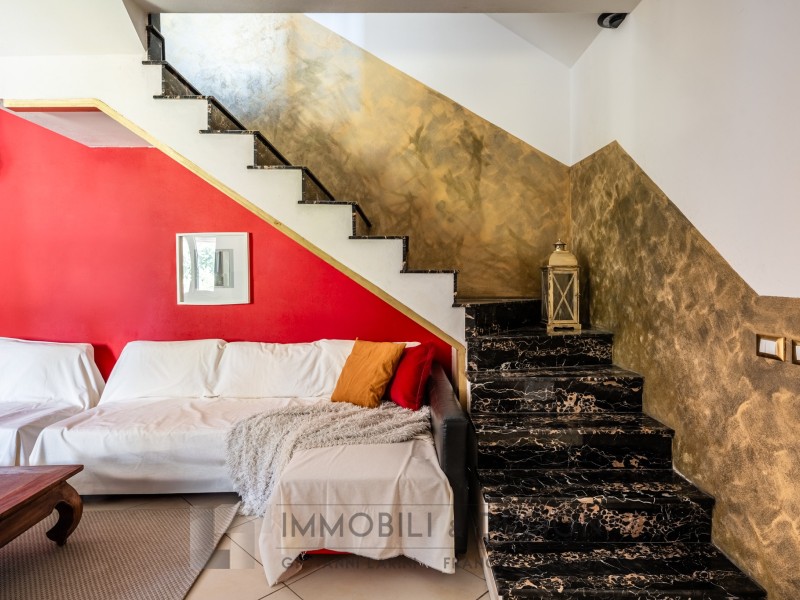 Upon entering, you’ll be struck by the spacious living room, enhanced by a stunning black marble staircase with golden veins—an architectural detail that conveys both character and sophistication. The modern, functional corner kitchen is the heart of the home, seamlessly connected to the outdoor areas for a fluid indoor-outdoor lifestyle. On the ground floor, a wellness area with laundry, a bathroom, and a garage complete the comfort.