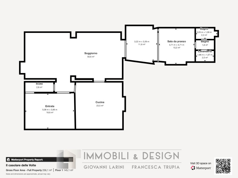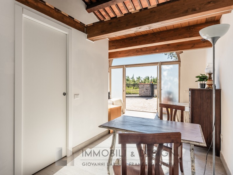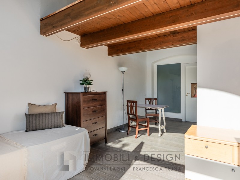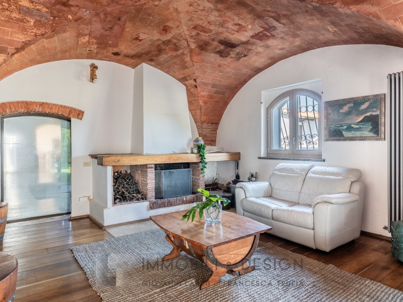 The main residence, arranged over two levels, features on the ground floor an entrance hall with staircase leading to the upper level, a spacious living room with beautiful brick vaulted ceilings, a large kitchen, an additional sitting room, and a guest bathroom.