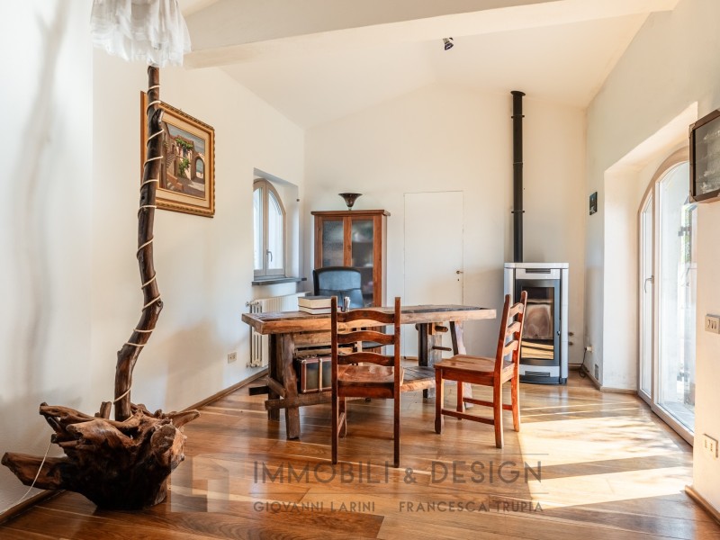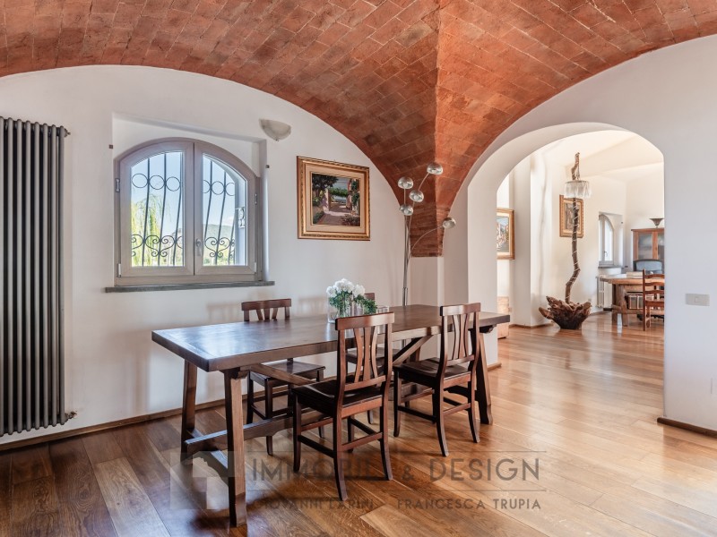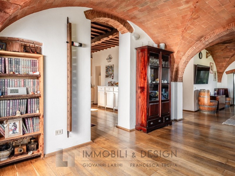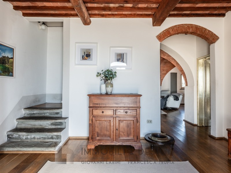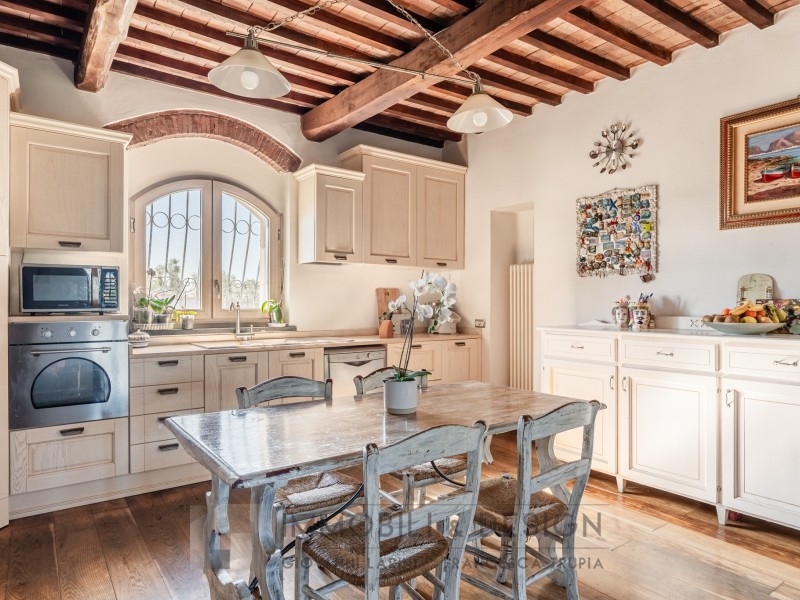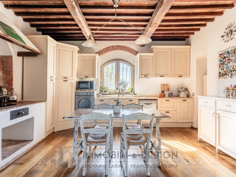 The atmosphere is that of authentic Tuscan living, where wood-beamed ceilings, terracotta floors, and arched windows are embraced by abundant natural light.