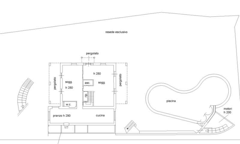 La cucina, gli spazi di servizio e l’uscita sul giardino completano il livello, che si connette direttamente alla zona piscina tramite percorsi esterni.